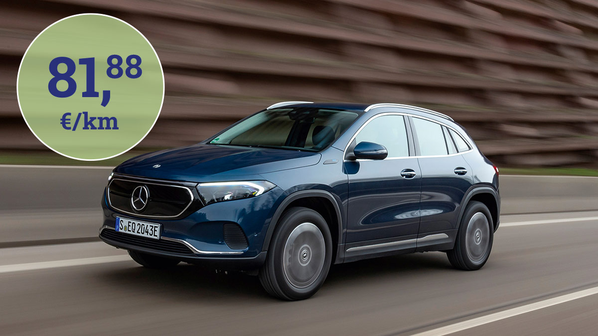 Die wahrscheinlich größte Überraschung: Der Mercedes EQA, ein E-Auto einer deutschen Premiummarke, sticht in dieser Rangfolge positiv hervor. 45.933 Euro Fahrzeug-Neupreis bei 561 Kilometern Reichweite: Das ergibt umgerechnet 81,88 Euro, die Mercedes-EQA-Käuferinnen und -Käufer für jeden Kilometer Reichweite in der Anschaffung zahlen – damit erreicht das Modell Platz zwei im Ranking.