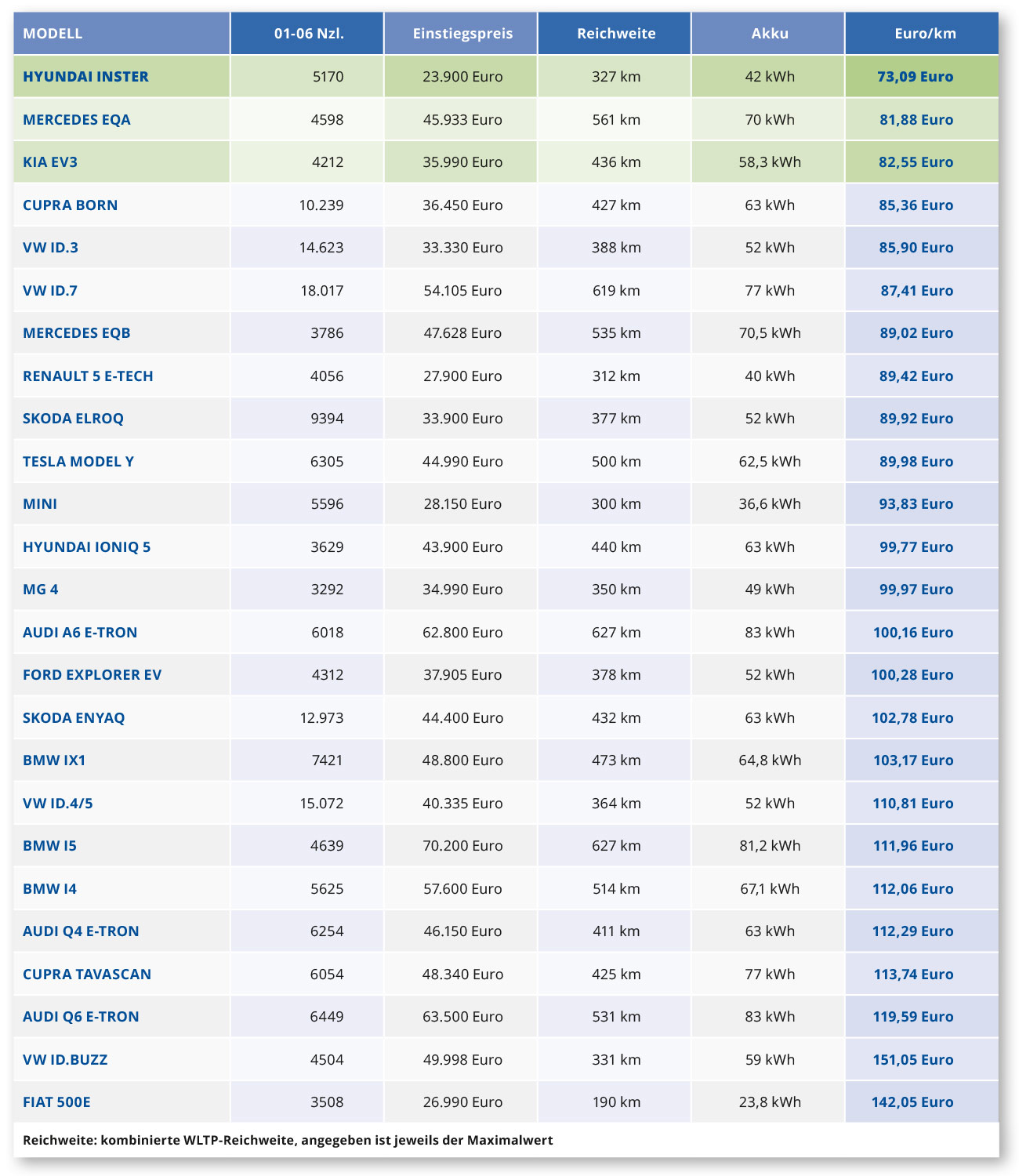 Doch nicht nur die günstigen Kleinwagenmodelle der Hersteller sind aus Kostenperspektive interessant. Auch SUVs, Kompakt- und Mittelklassefahrzeuge bieten reichlich Reichweite fürs Geld. Das zeigt der Blick auf die Tabelle auf Seite 19. Aufgelistet sind die 25 im ersten Halbjahr 2025 meistverkauften E-Autos in Deutschland, sortiert nach ihrem Preis-Reichweiten-Verhältnis. Das heißt: Die Modelle sind nach dem Preis geordnet, den ein Kilometer Reichweite in der Anschaffung kostet. Die Limousine VW ID.7 etwa, in den ersten sechs Monaten 2025 das beliebteste Modell in Deutschland, bietet in der Einstiegsvariante zum Preis von 54.105 Euro eine Reichweite von 619 Kilometer. Das ergibt umgerechnet einen Kaufpreis von 87,41 Euro, die für jeden Kilometer gezahlt werden müssen. Damit reiht sich der Wagen im oberen Mittelfeld ein.