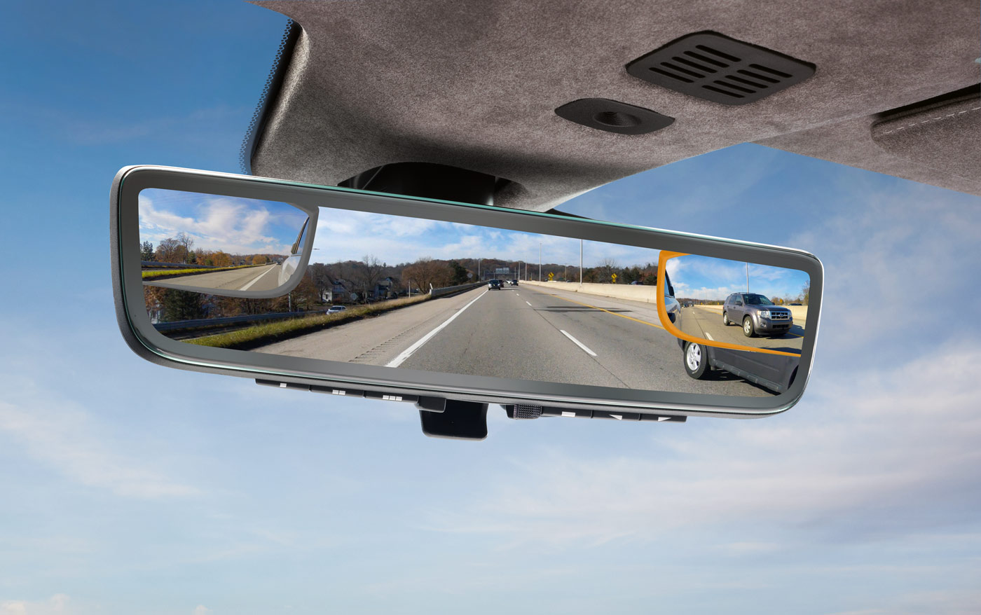 Der Full Display Mirror von Gentex zeigt auf Wusch ein gestochen scharfes Kamerabild. Damit wird Blendung vernieten und das Blickfeld auf den Bereich hinter dem Auto erweitert.